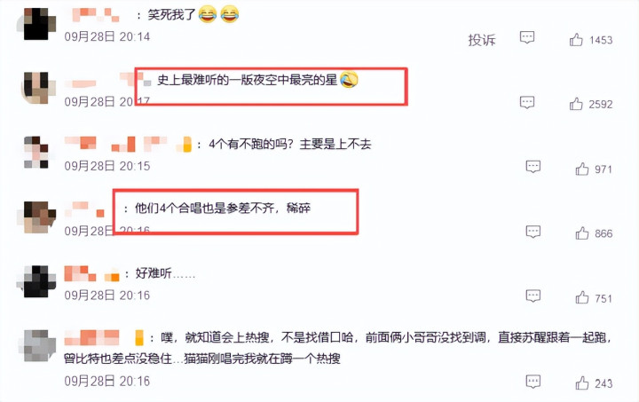 这一组的演唱堪称“灾难现场”,被网友调侃为“史上最难听的一版《夜空中最亮的星》”。